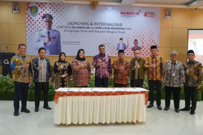BENGKULU – Dalam menerapkan Sumber Daya Aparatur yang berkompeten di bidang pelayanan publik, Pemerintah Kabupaten Bengkulu Tengah melalui Badan Kepegawaian dan Pengembangan Sumber Daya Manusia (BKPSDM) melaksanakan Launching dan Internalisasi Core Value BerAKHLAK serta Employer Branding Aparatur Sipil Negara (ASN) di Ruang Lingkup Pemerintahan Kabupaten Bengkulu Tengah (Benteng) yang berlangsung di Ballroom Grage Hotel Bengkulu. Sabtu (13/11/2022).