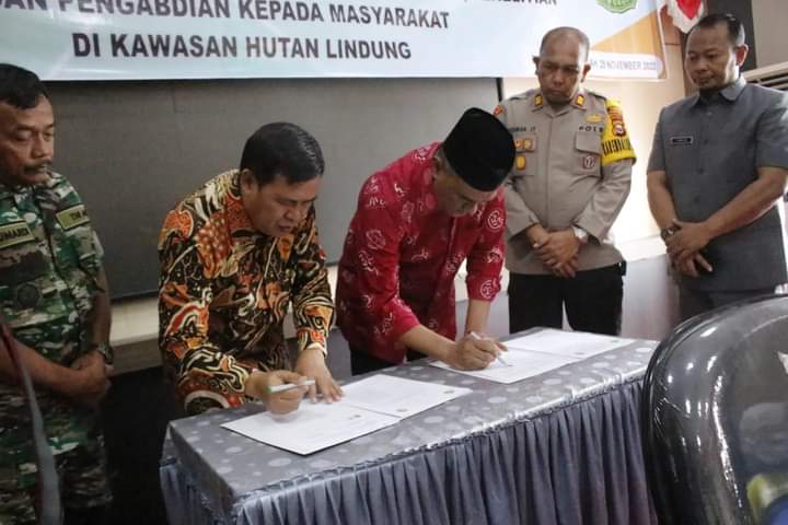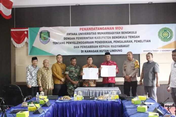 Warnabengkulu co.id//BENGKULU TENGAH- Pemkab Bengkulu Tengah (Benteng) melakukan Penandatanganan Memorandum Of Understanding (MoU) dengan Universitas Muhammadiyah Bengkulu tentang penyelenggaraan Pendidikan, Pengajaran, Penelitian dan pengabdian kepada masyarakat di kawasan hutan lindung.