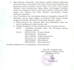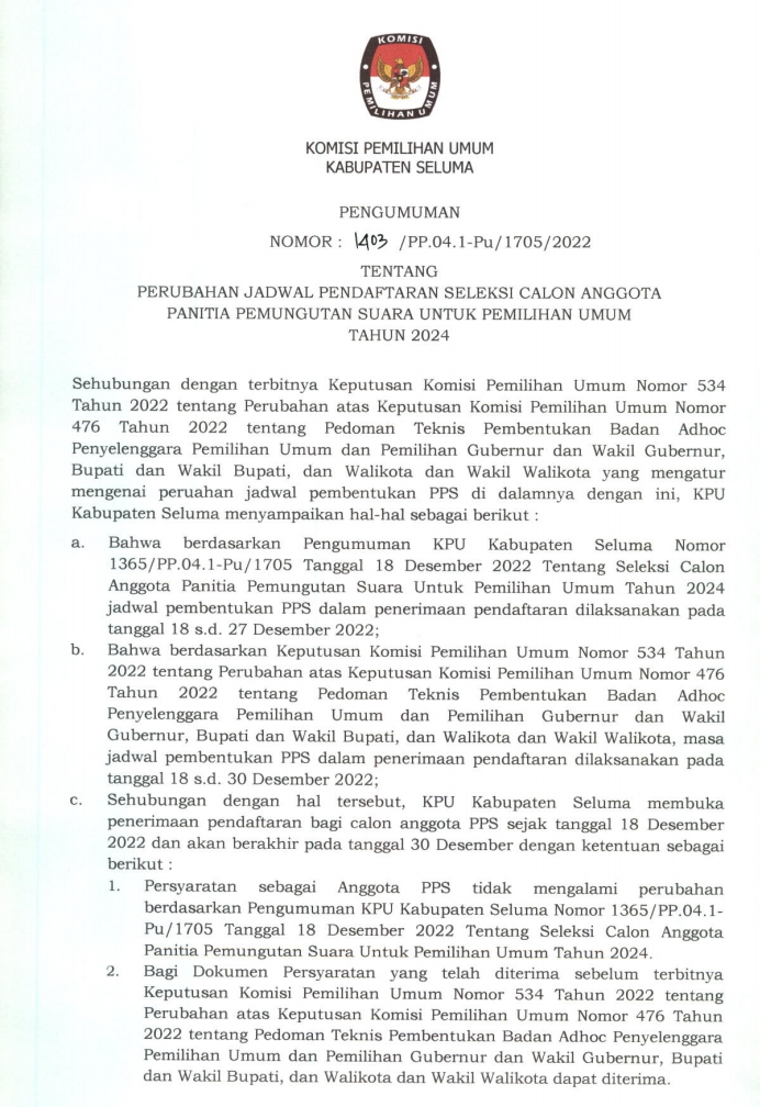 Sehubungan dengan hal tersebut, KPU Kabupaten Seluma membuka penerimaan pendaftaran bagi calon anggota PPS, sejak tanggal 18 Desember 2022 dan akan berakhir pada tanggal 30 Desember.