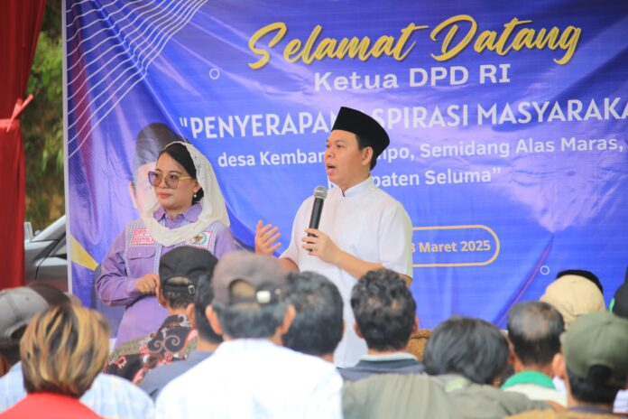 WARNABENGKULU.CO.ID, SELUMA– Ketua Dewan Perwakilan Daerah (DPD) RI, Sultan Bakhtiar Najamudin memuji keaktifan Senator Apt Destita Khairilisani S.Farm., MSM., di lembaga DPD RI. Hal itu Ia utarakan saat menyerap aspirasi masyarakat Desa Kembang Mumpo, Kecamatan Semidang Alas Maras, Kabupaten Seluma, pada Minggu (23/3/2025).