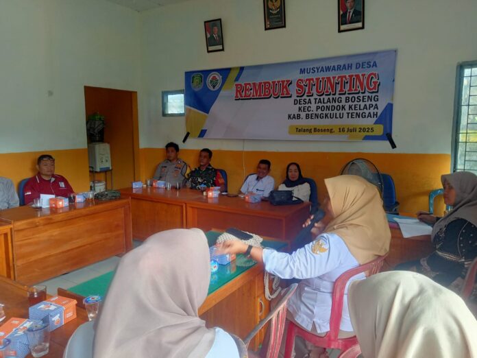 Bengkulu Tengah – Pemerintah Desa (Pemdes) Talang Boseng, Kecamatan Pondok Kelapa Kabupaten Bengkulu Tengah menggelar kegiatan Rembuk Stunting pada Rabu (16/07/2025) sebagai bagian dari upaya percepatan penurunan stunting di wilayah desa. Kegiatan ini berlangsung di Desa Talang Boseng dan dihadiri oleh berbagai pihak terkait, termasuk perwakilan dari Pemerintah Kecamatan Pondok Kelapa, Puskesmas, BPD, TP PKK, kader posyandu, tokoh masyarakat, serta perwakilan orang tua balita.