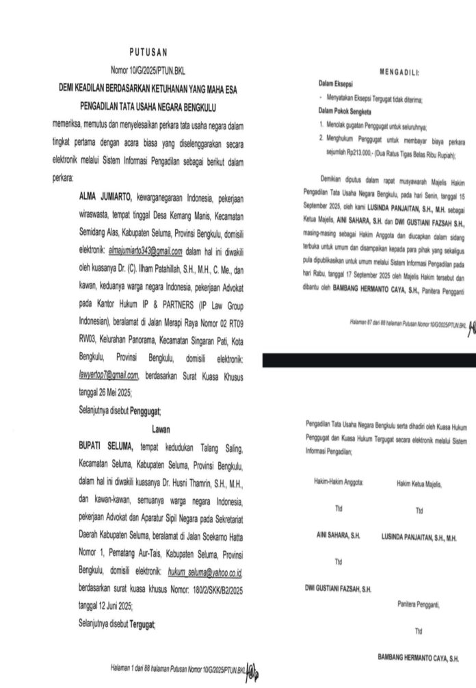 WARNABENGKULU.CO.ID, SELUMA– Pemerintah Kabupaten (Pemkab) Seluma memenangkan gugatan Kepala Desa (Kades) ) Kemang Manis Kecamatan Semidang Alas, Alma Juniarto. Pengadilan Tinggi Tata Usaha Negara (PTUN) Bengkulu menolak secara keseluruhan eksepsi dan gugatan Alma Juniarto.