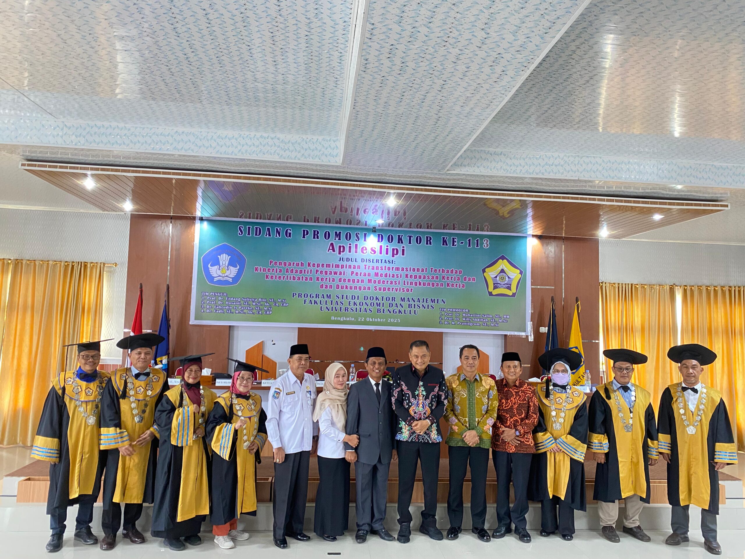 Warnabengkulu.co.id//Bengkulu- Apileslipi, Kepala Badan Kepegawaian dan Pengembangan Sumber Daya Manusia berhasil meraih gelar Doktor dengan predikat memuaskan pada program studi Manajemen, Fakultas Ekonomi Universitas Bengkulu, pada Rabu (22/10/2025) dengan judul disertasi “Pengaruh Kepemimpinan Transformasional Terhadap Kinerja Adaptif Pegawai, Peran Mediasi Kepuasan Kerja dan Keterlibatan Kerja dengan Moderasi Lingkungan Kerja dan Dukungan Supervisor”.