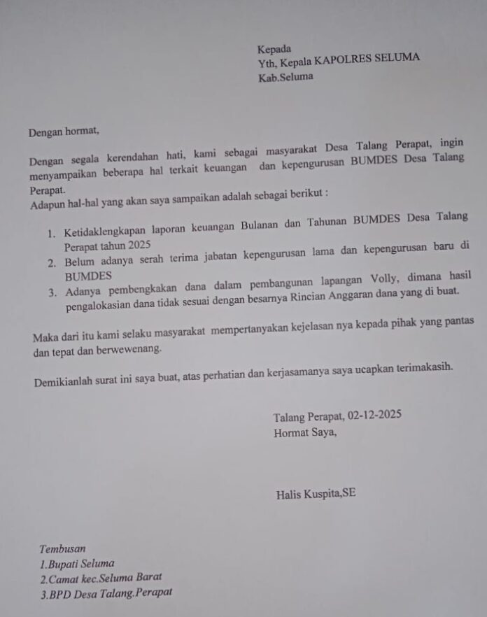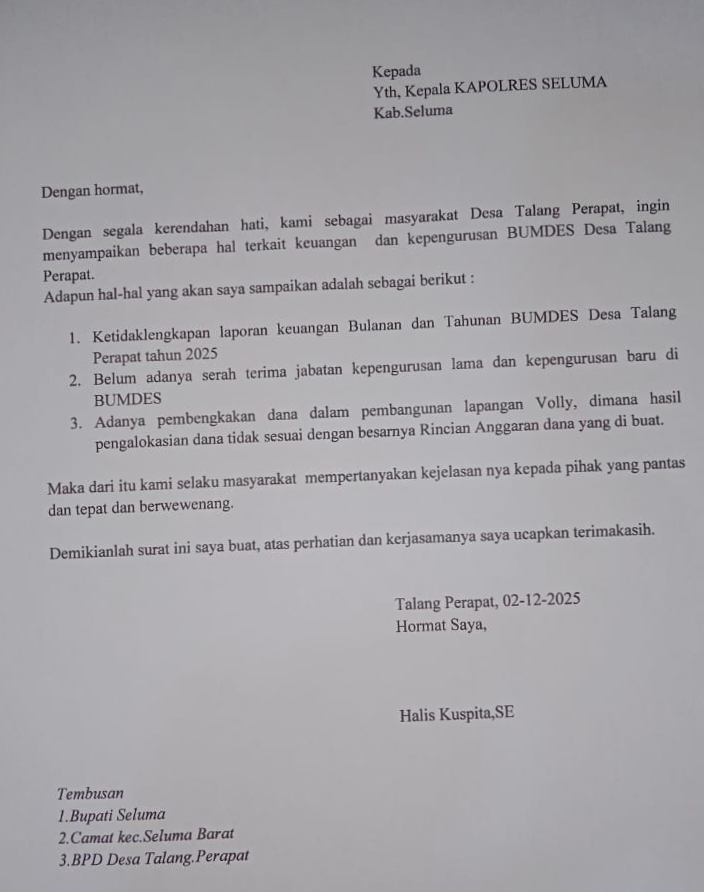 “Pengelolaan keuangan baik dana desa juga Bumdes tidak ada transparan. Jadi kami masyarakat sepakat melaporkan perkara ini ke Polres Seluma,” terang Halis, Kamis siang 18 Desember 2025.