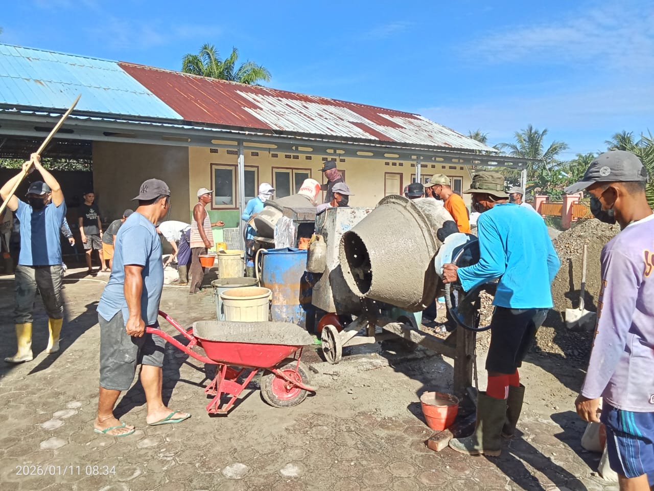 Gotong royong difokuskan pada pengecoran teras masjid. Sejak pagi, puluhan warga berdatangan membawa peralatan. Tak hanya kaum bapak, para ibu pun turut ambil bagian membantu pekerjaan. Mulai dari menyiapkan konsumsi hingga membantu pekerjaan ringan yang dapat dikerjakan.