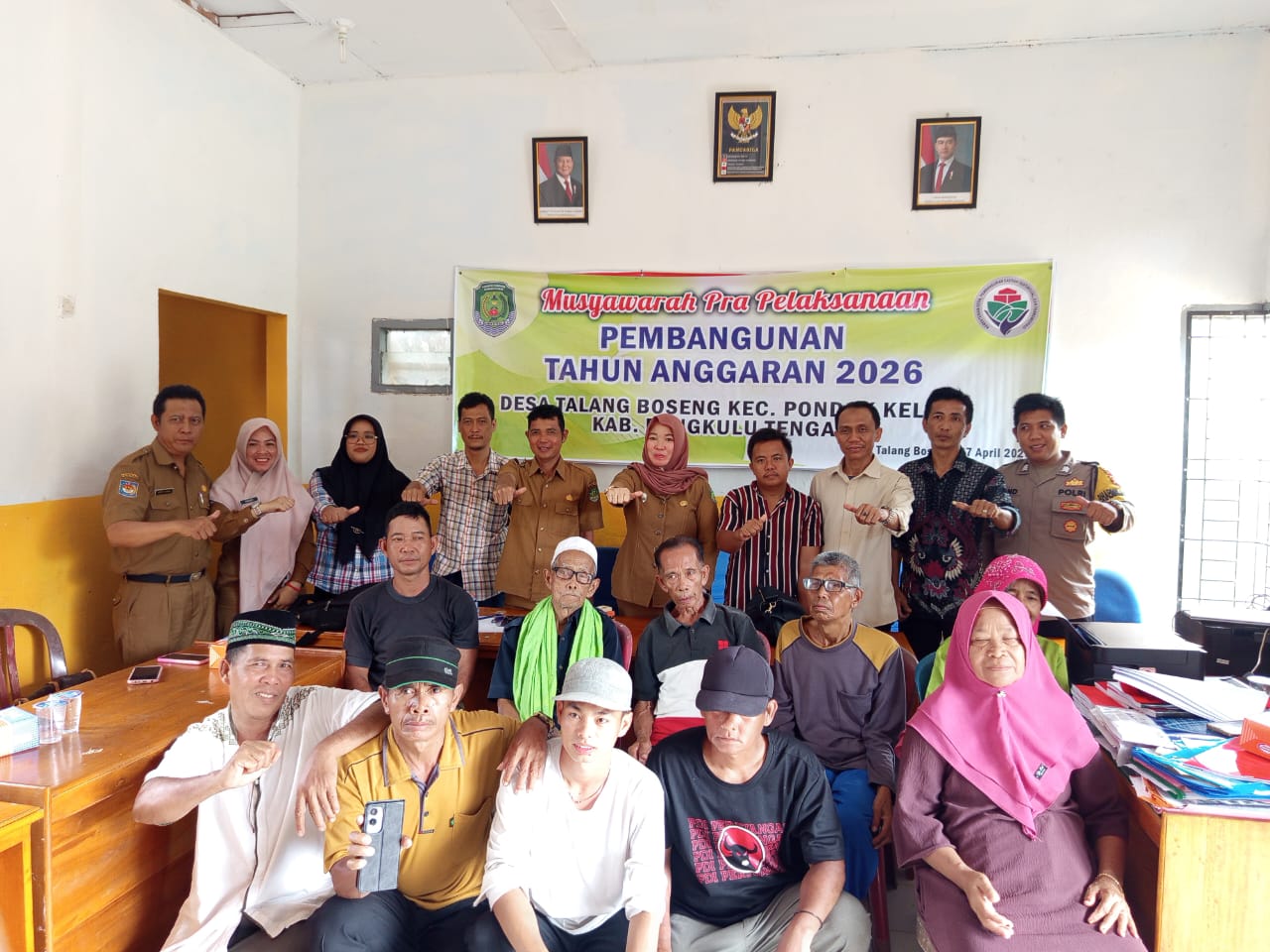 Ada sebanyak 10 orang KPM menerima BLT-DD (Bantuan Langsung Tunai-Dana Desa) tahun 2026. Ada 2 item pembangunan fisik tahun 2026 akan dilaksanakan oleh Pemerintah Desa Talang Boseng yang berlokasi di Desa Talang Boseng Kecamatan Pondok Kepala Kabupaten Bengkulu Tengah pada Selasa (07/04/2026).